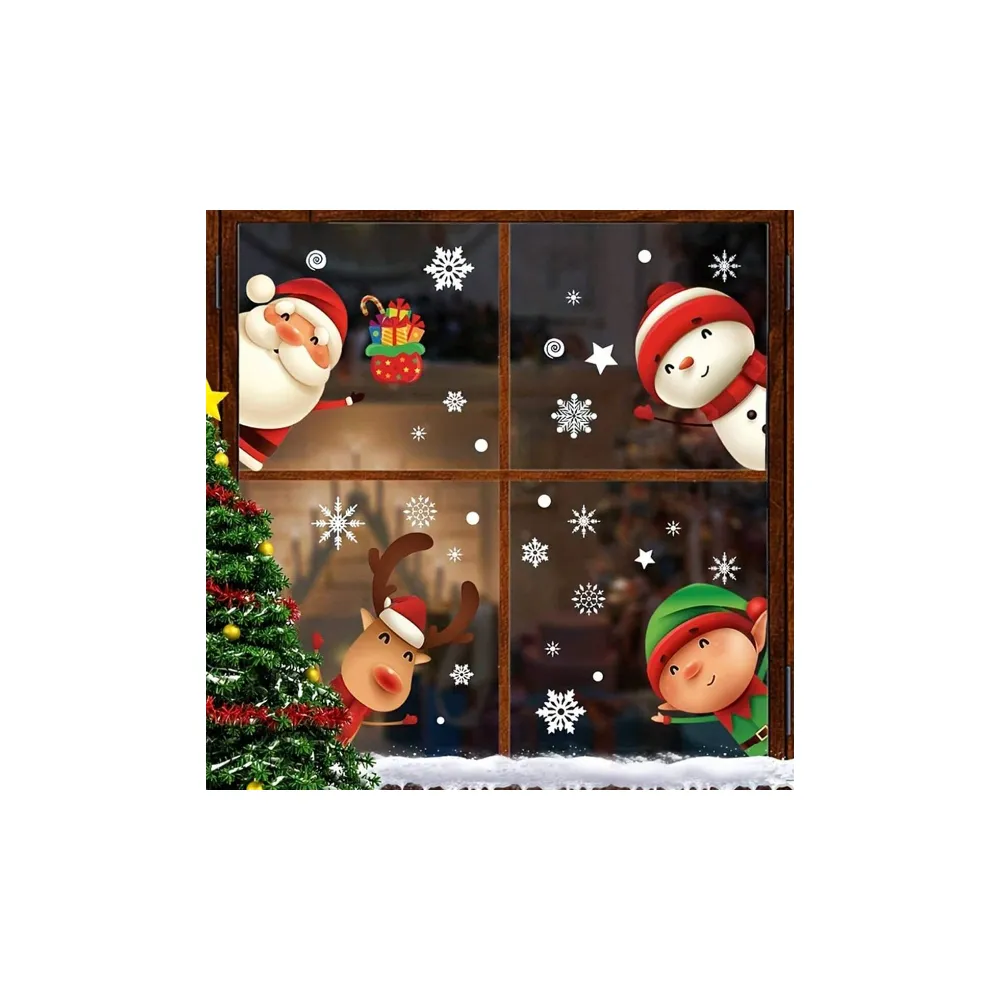 Sticker Perete Autocolant Mos Craciun, Ren, Om de Zapada, Fulgi, 9 buc, 26x18cm, model Geam - 35003