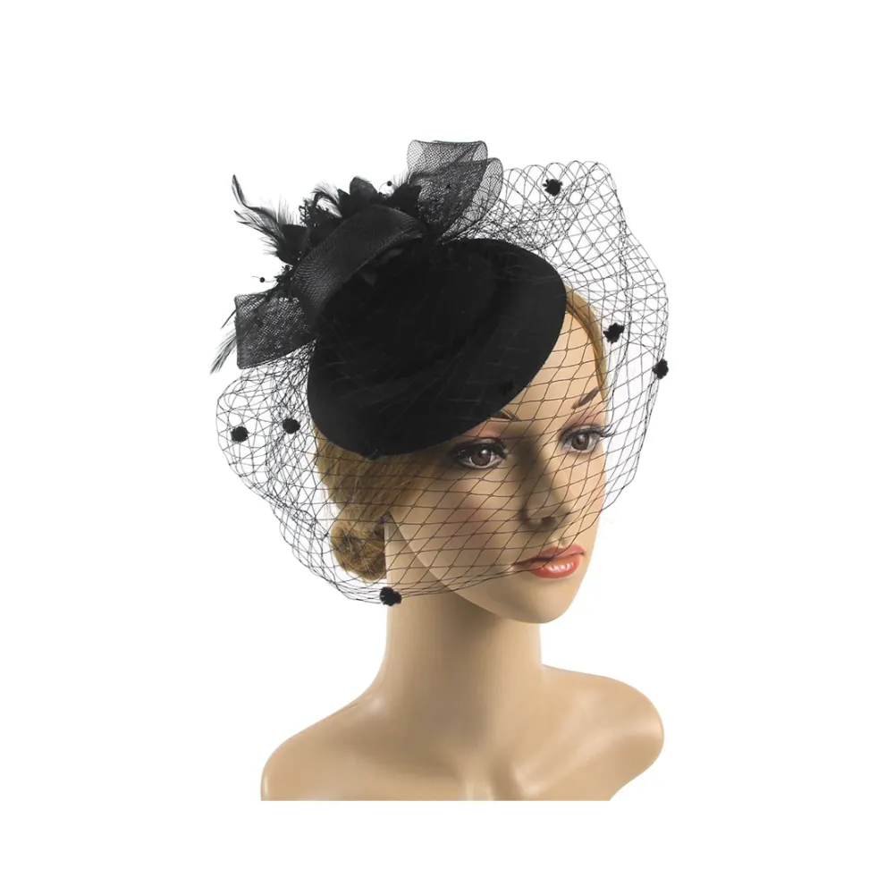 Accesoriu Palarie Dama, cu Pene, Flori si Voal Negru - 07554