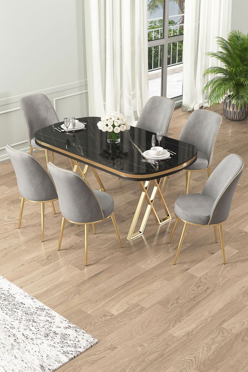 Set masă și scaune (7 piese), Hanah Home, Lai, Marmură neagră / Auriu / Gri
