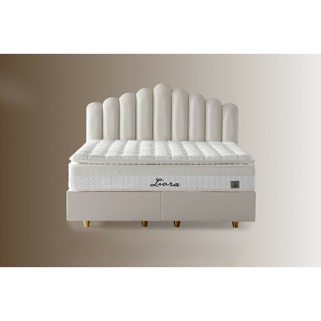 Set pat tapițat Liora 160x200 cm crem cu somieră rabatabilă, ladă depozitare și saltea inclusă