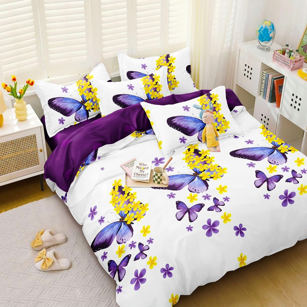 Lenjerie pat dublu, bumbac satinat, cearsaf clasic, 4 piese, Alb, Mov, fluturi