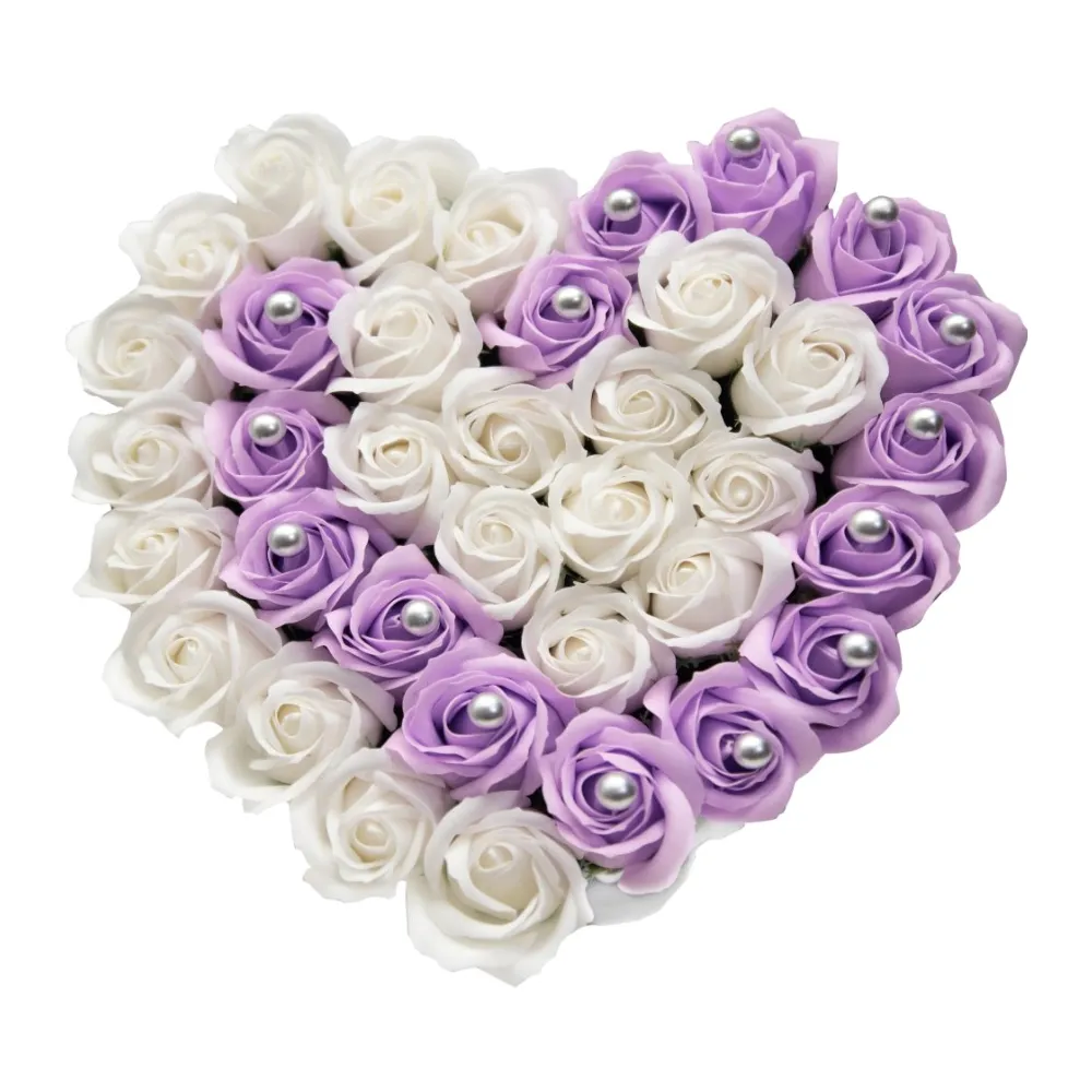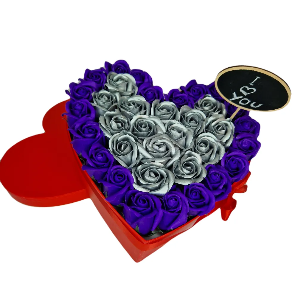 Aranjament Floral Trandafiri Sapun - Cutie Inimioara Argintiu cu Mov 31 Trandafiri - VLTN121