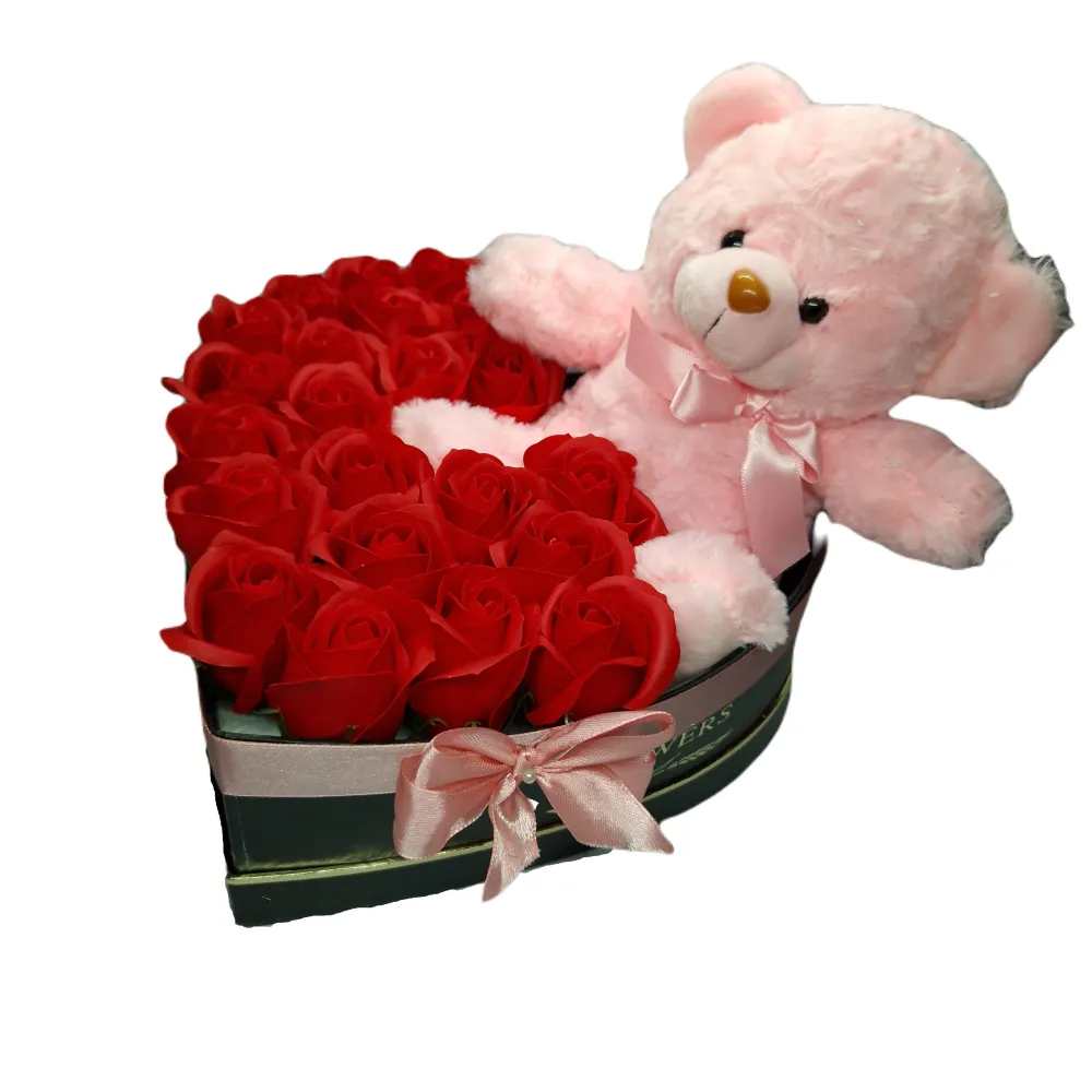 Aranjament Floral Trandafiri Sapun - Cutie Inimioara Rosu cu Ursulet Roz 21 Trandafiri - VLTN123