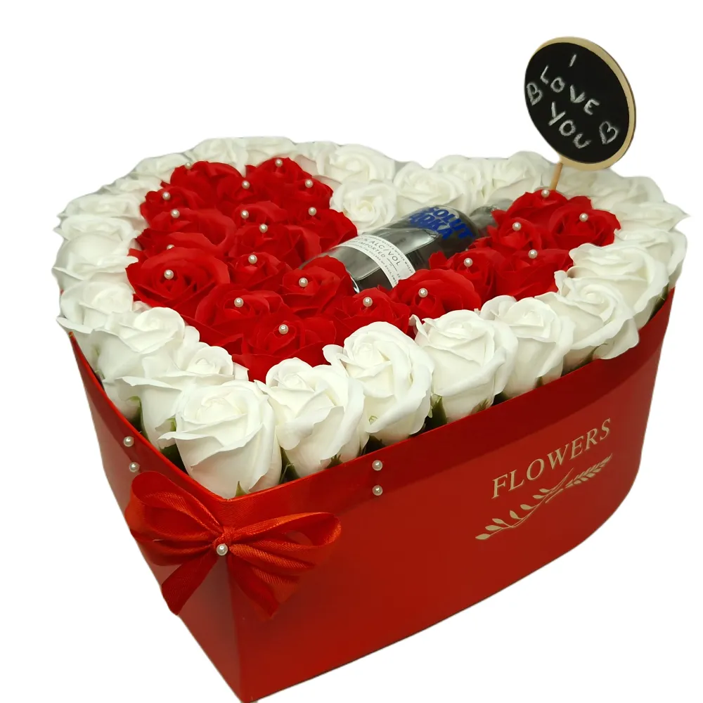 Aranjament Floral Trandafiri Sapun - Cutie Inimioara Rosu si Alb cu Bautura 51 Trandafiri - VLTN122