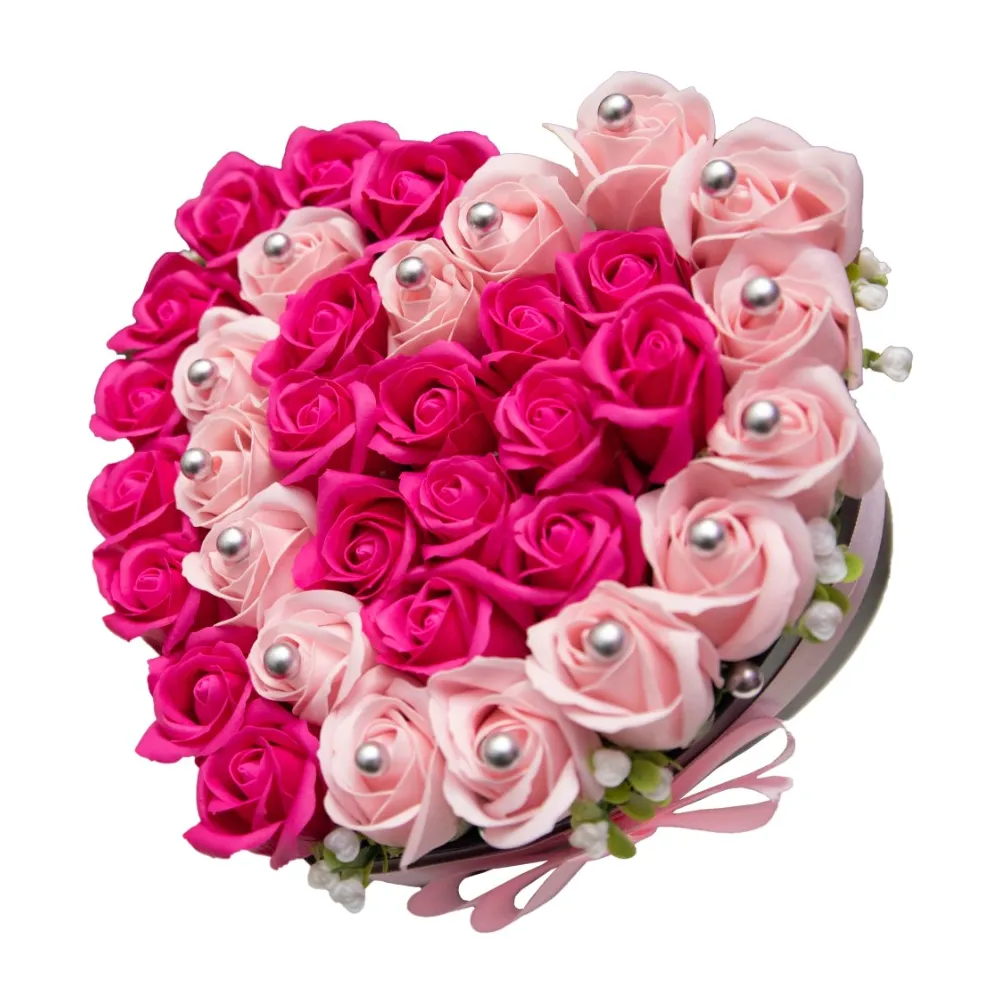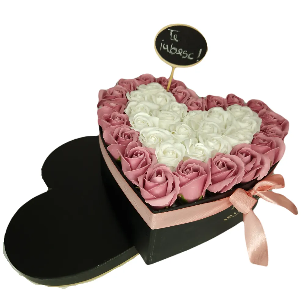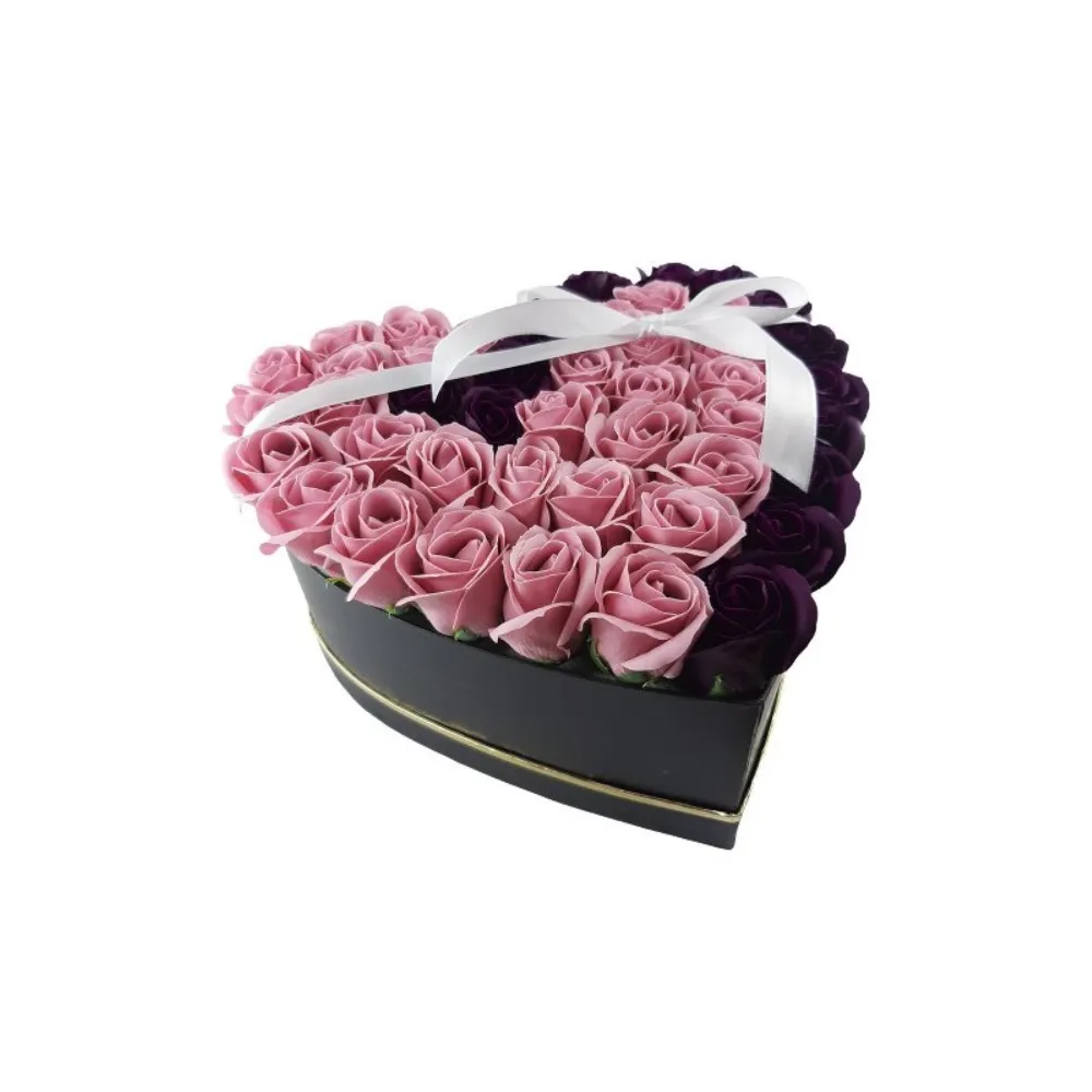 Aranjament Floral Trandafiri Sapun - Cutie Inimioara Roz cu Alb 39 Trandafiri - VLTN120