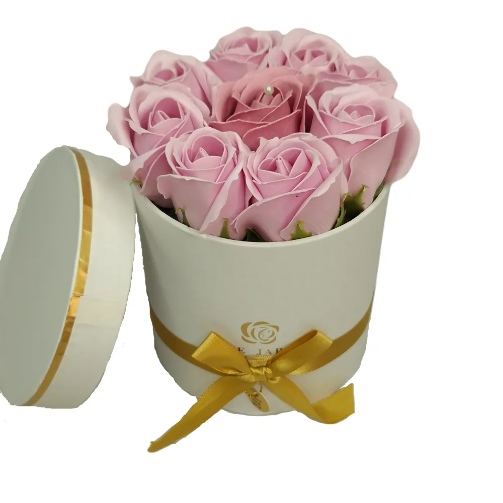 Aranjament Floral Trandafiri Sapun - Cutie Rotund Roz 9 Trandafiri - VLTN124