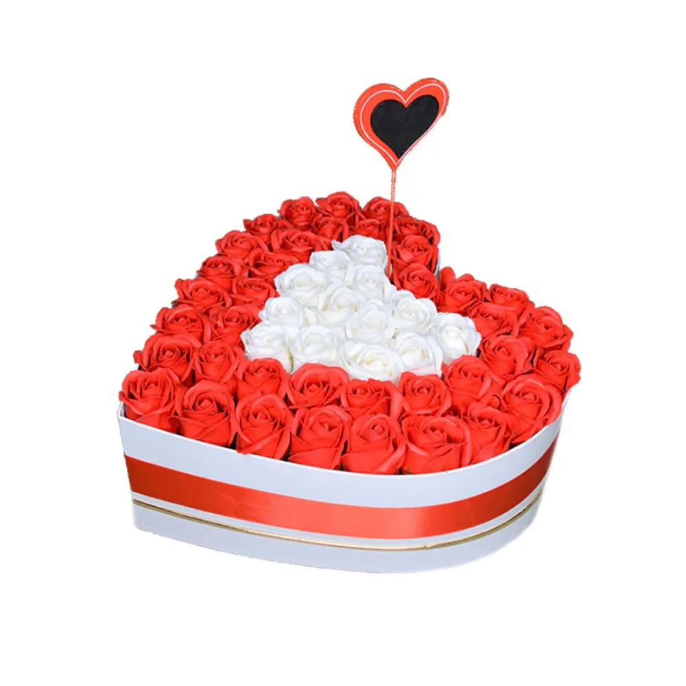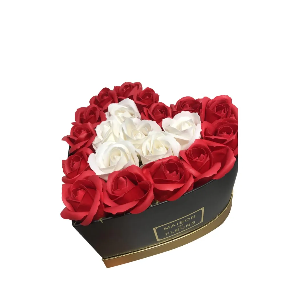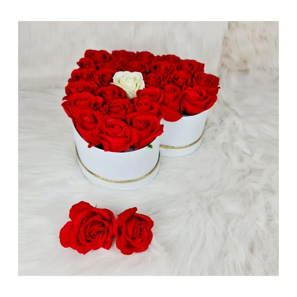 Aranjament Floral Trandafiri Sapun - Cutie Inima 21 Trandafiri Alb cu Rosu - VLTN108