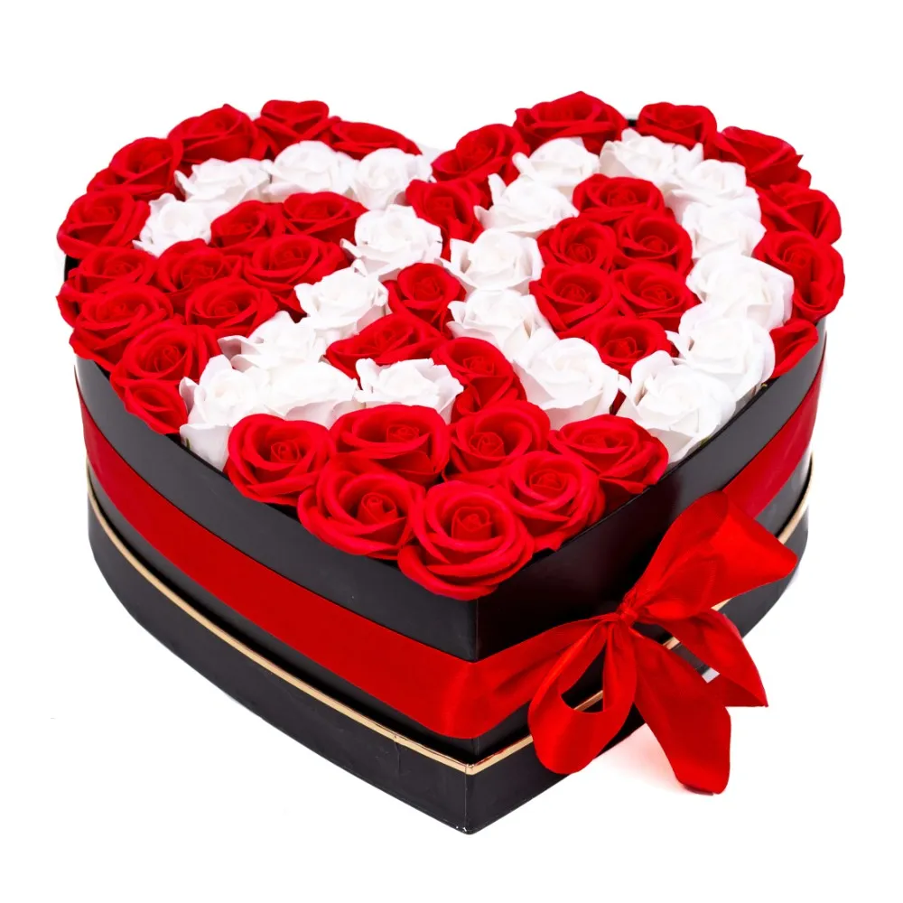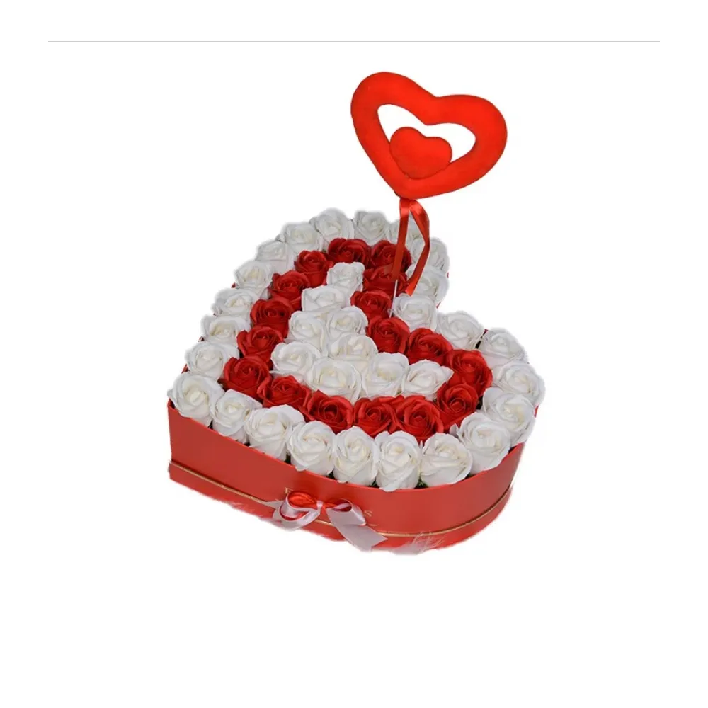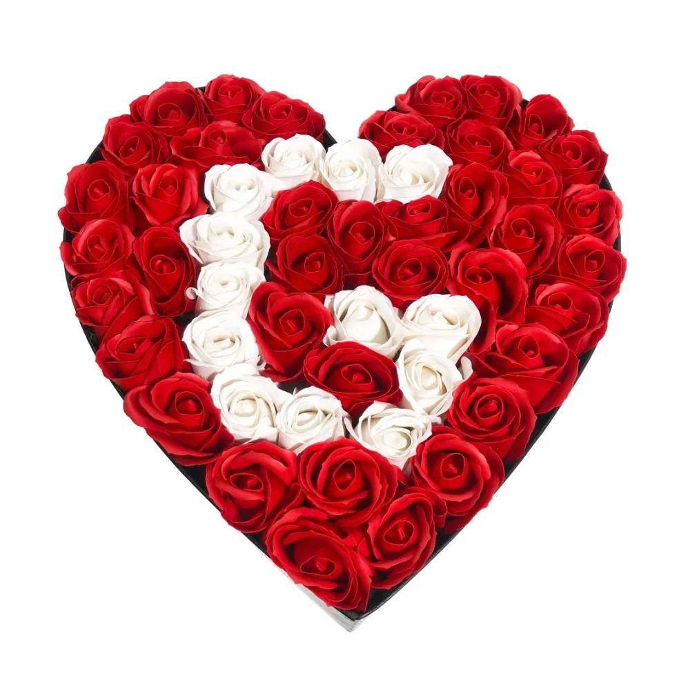 Aranjament Floral Trandafiri Sapun - Cutie Inima Litera (orice litera) 49 Trandafiri Rosu cu Alb - VLTN127