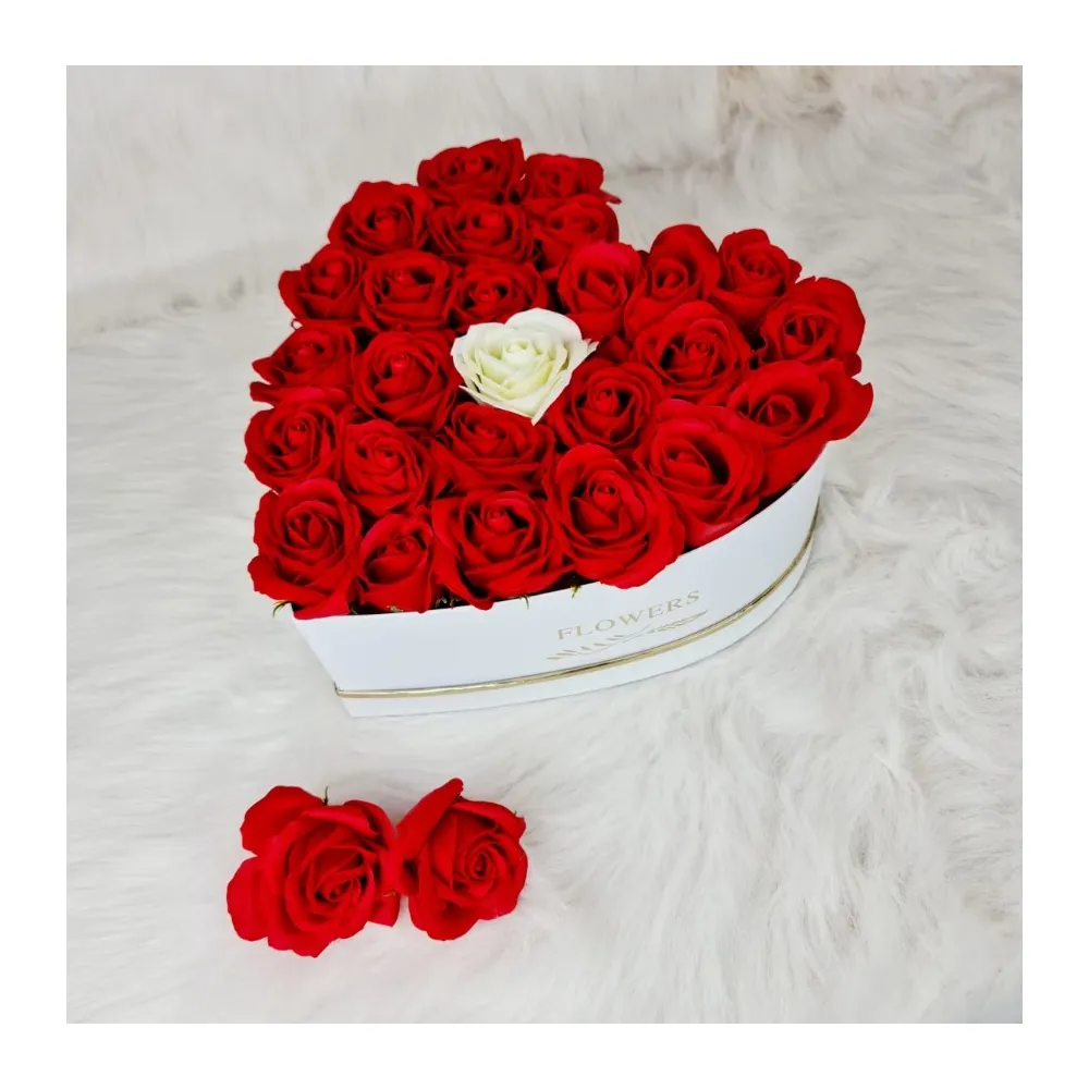Aranjament Floral Trandafiri Sapun - Cutie Inima 31 Trandafiri Rosu cu Alb - VLTN116