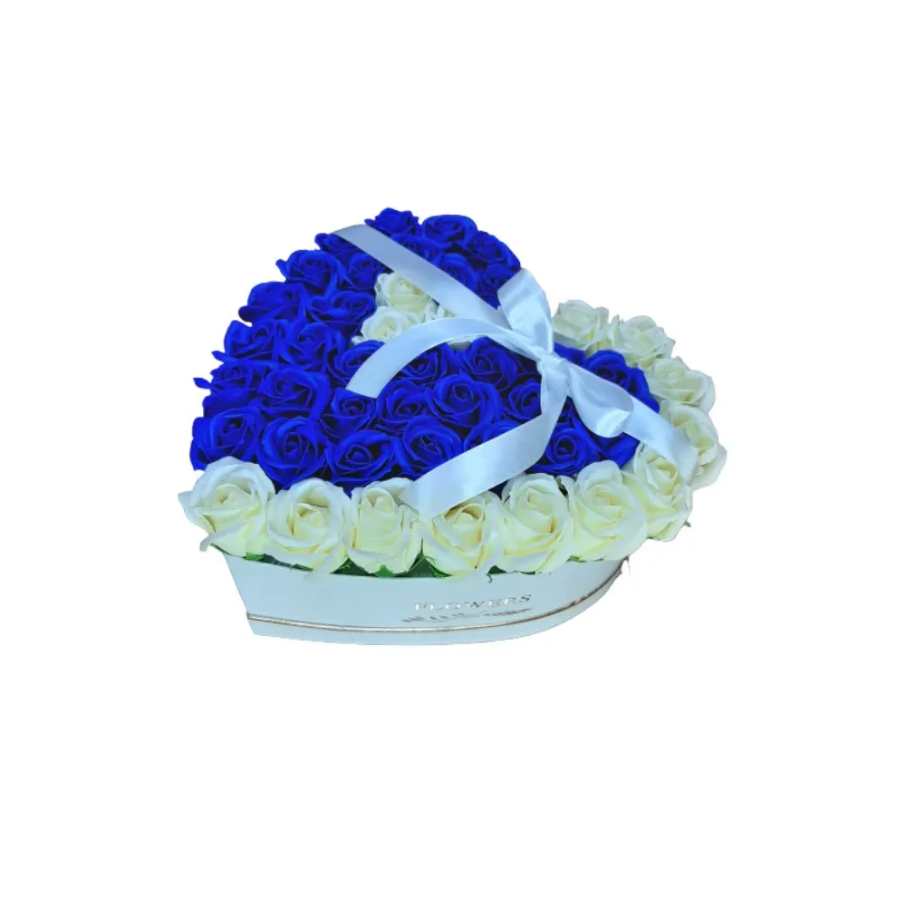 Aranjament Floral Trandafiri Sapun - Cutie Inima Cifra (orice cifre) 55 Trandafiri Albastru cu Alb - VLTN119