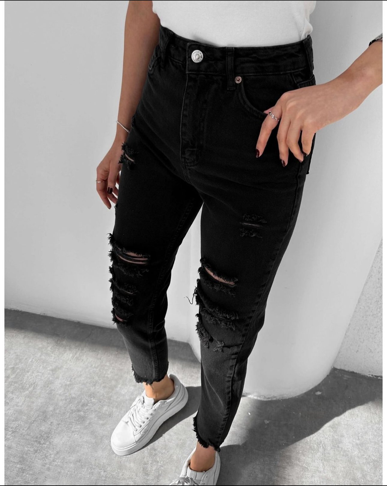 Blugi conici pentru femei, cu talie inalta, model rupt, Negru