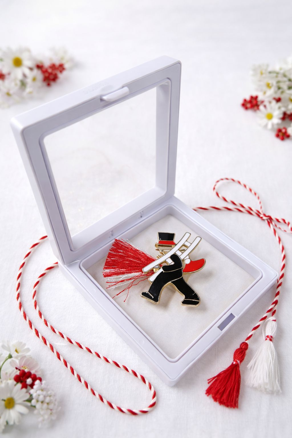 Brosa Martisor 5 cm, Cosar cu scara, in cutie 9x9 cm cu fereastra, cadou 1 Martie