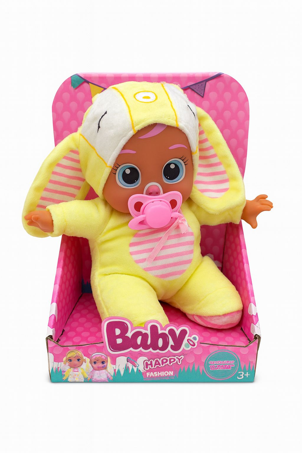 PAPUSA BEBE MUZICALA IN COSTUM GALBEN DE IEPURAS, CU SUZETA, 23X15X12cm