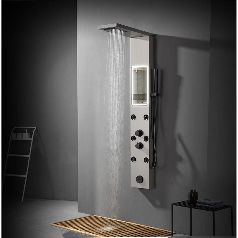 Panel de Dus cu Efect de Ploaie si Jeturi cu masaj, Oglinda LED Incorporata, Argintiu Periat