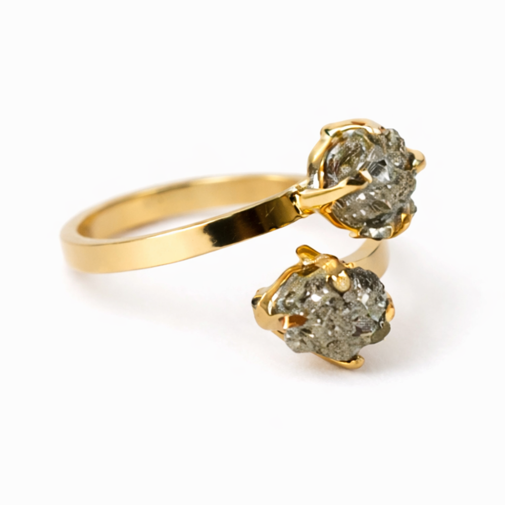 Inel Ajustabil Argint 925 placat cu aur de 18k si Dublu Pirita - Doua pietre, un singur centru interior