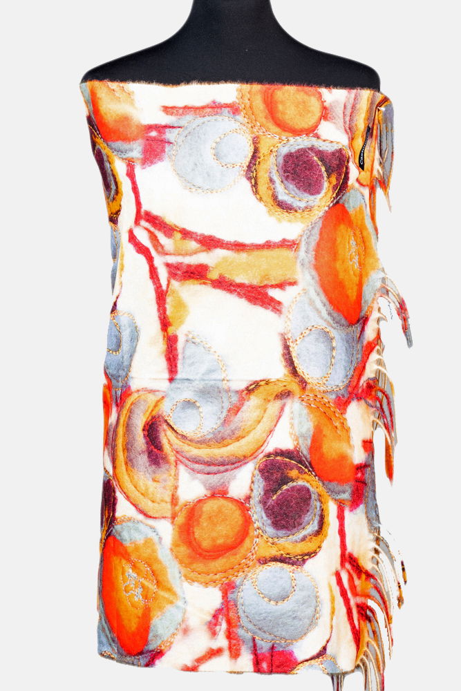 Esarfa cashmere cu modele multicolore in nuante de portocaliu si gri pe fond bej