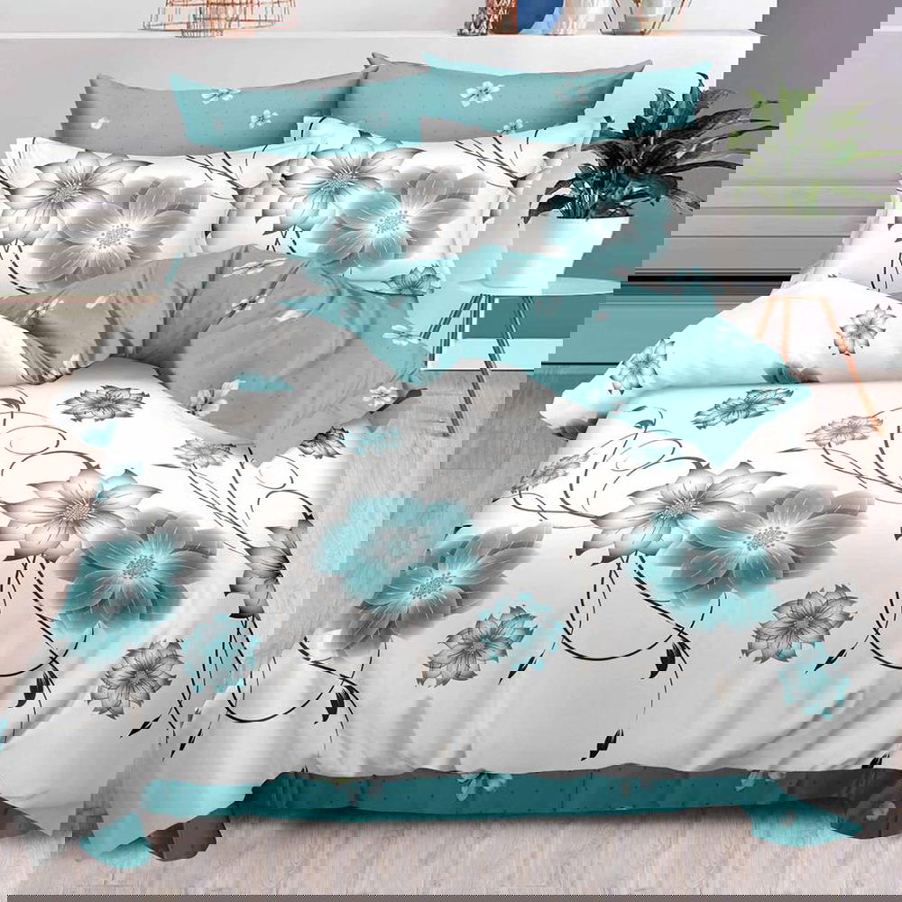 Lenjerie de Pat din Finet cu Elastic 6 Piese - 160/180x200 de Pucioasa - Flori Turcoaz - LFEN_D026B
