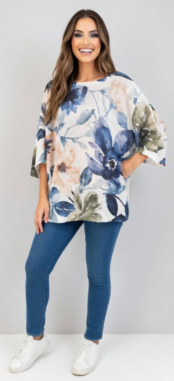 Bluza cu maneca fluture trei sferturi si imprimeu gradinent albastru si roz Talie unica