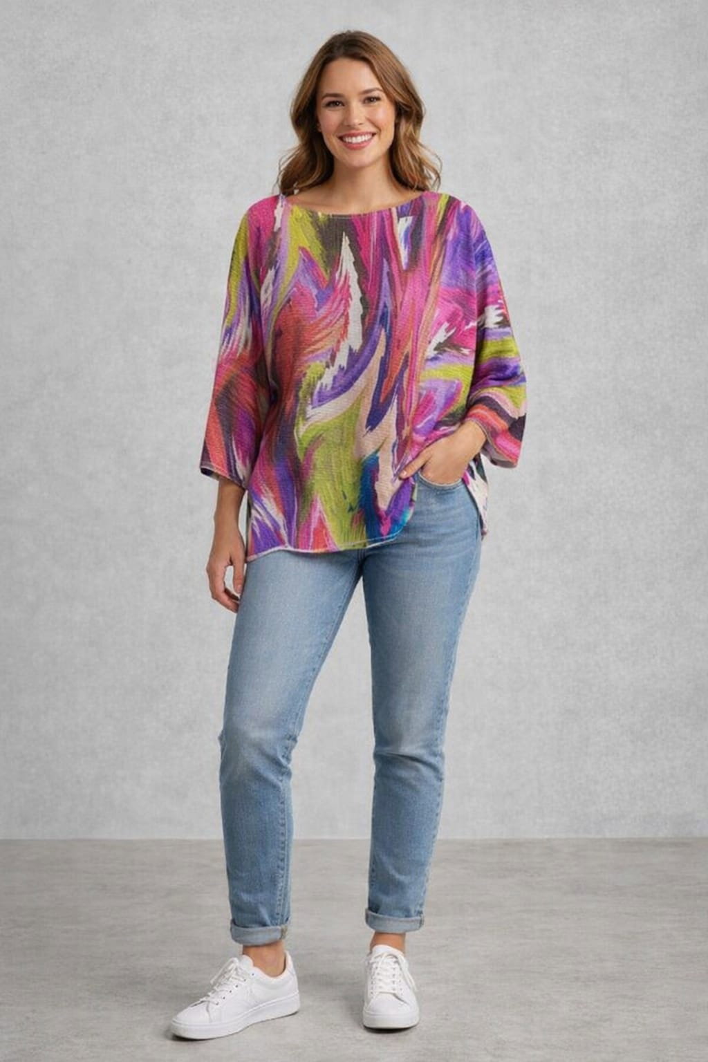 Bluza cu maneca fluture trei sferturi si imprimeu floare stilizata in culori vibrante Talie unica