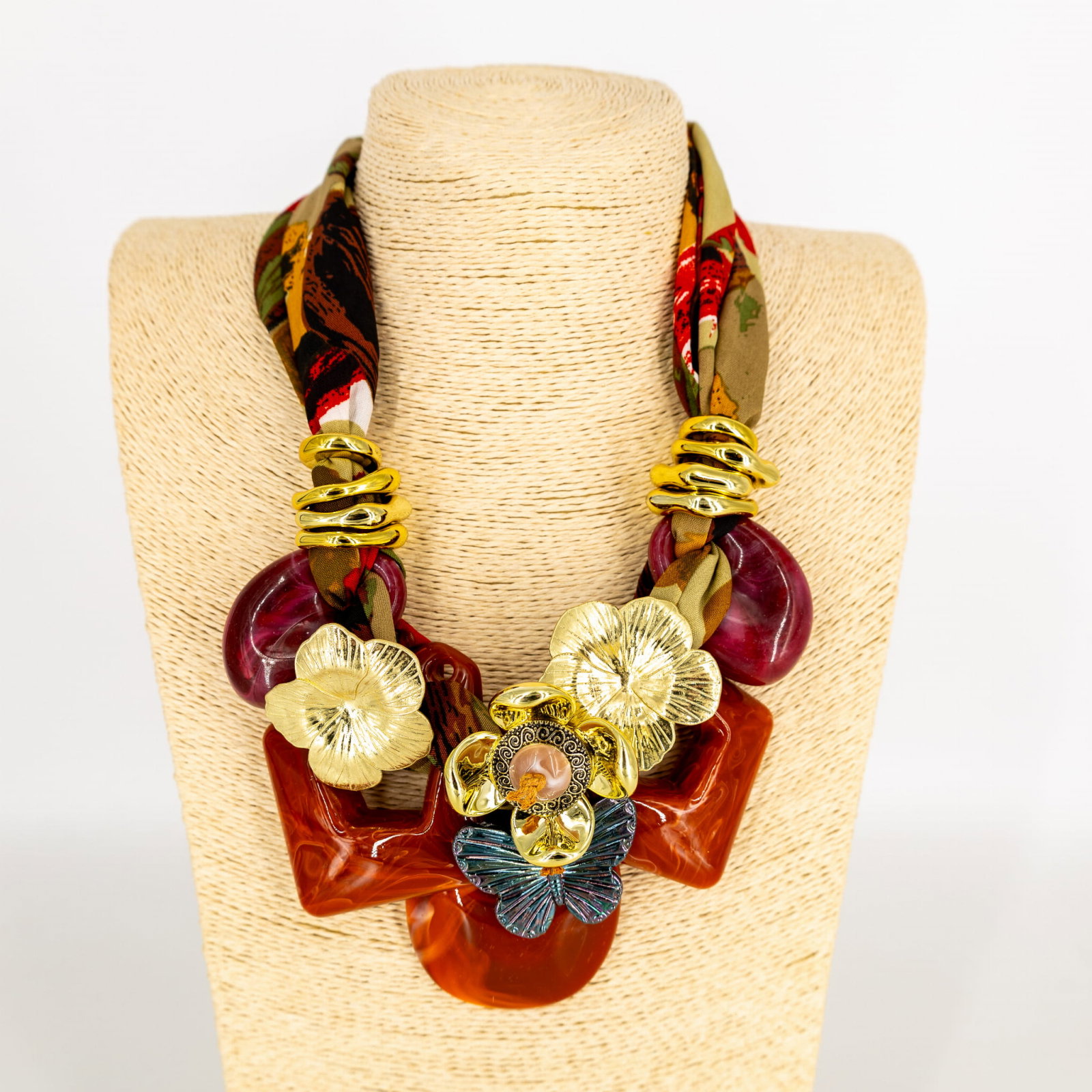 Colier statement fucsia cu flori aurii si fluture - stil italian