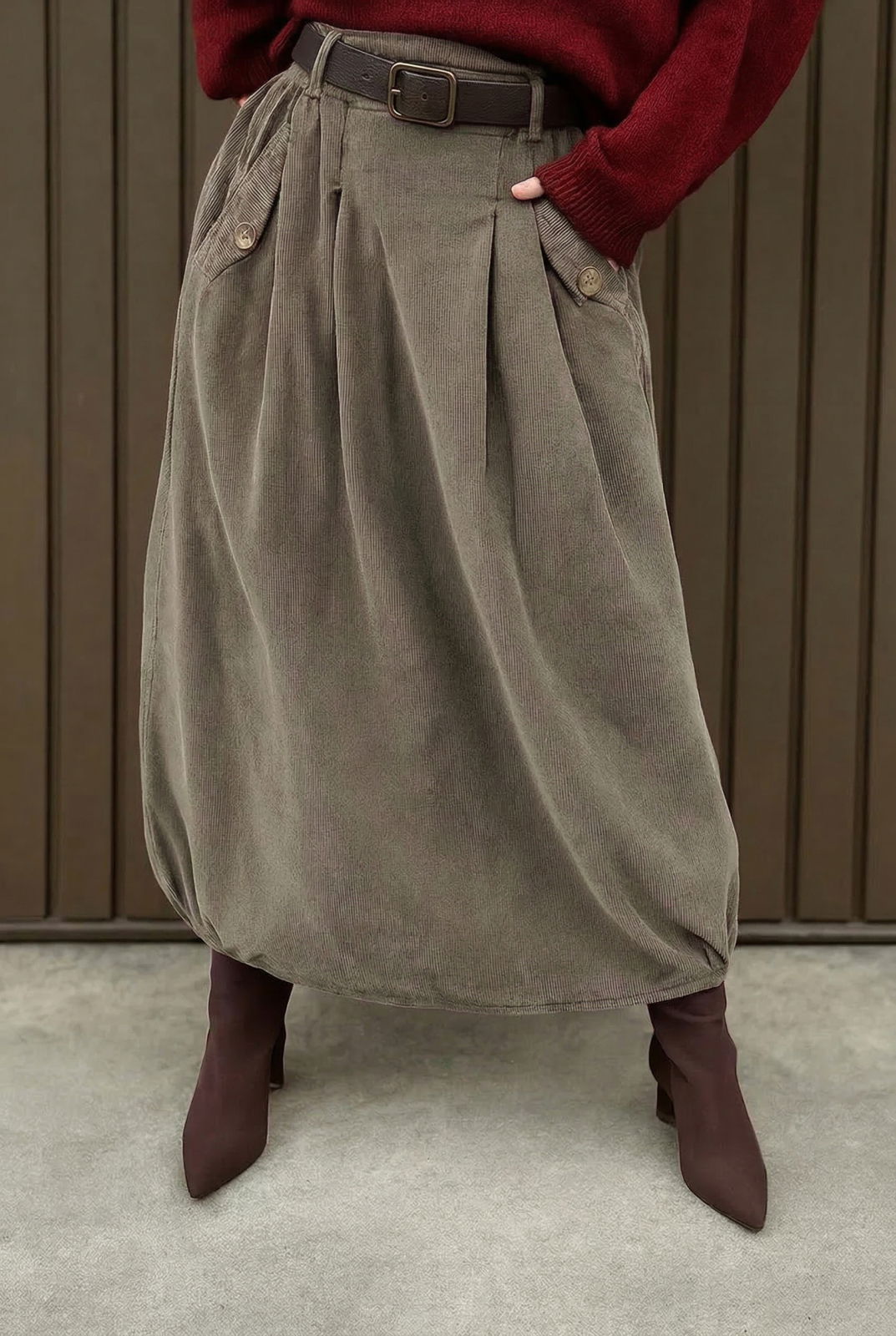 Fusta larga din in cu un colt prins, kaki Talie unica