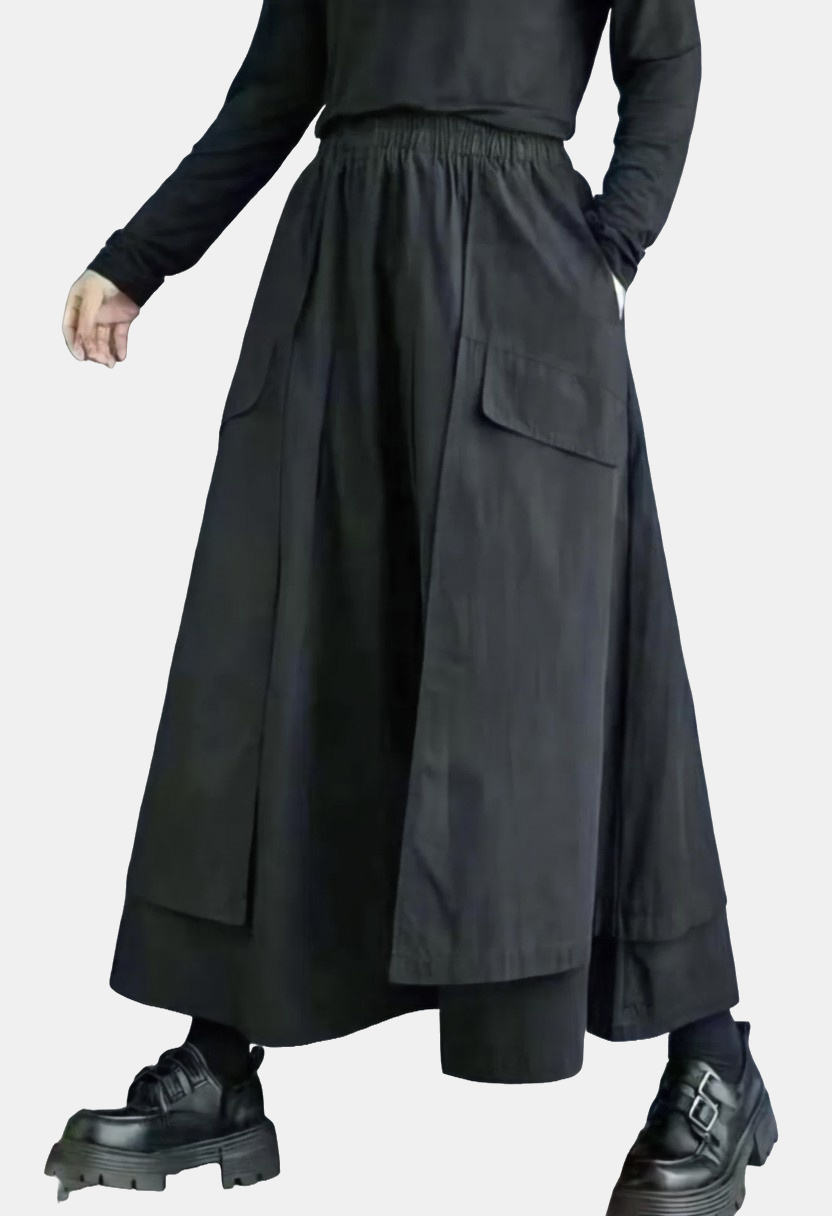 Fusta lunga ampla cu suprapuneri laterale, neagra Talie unica