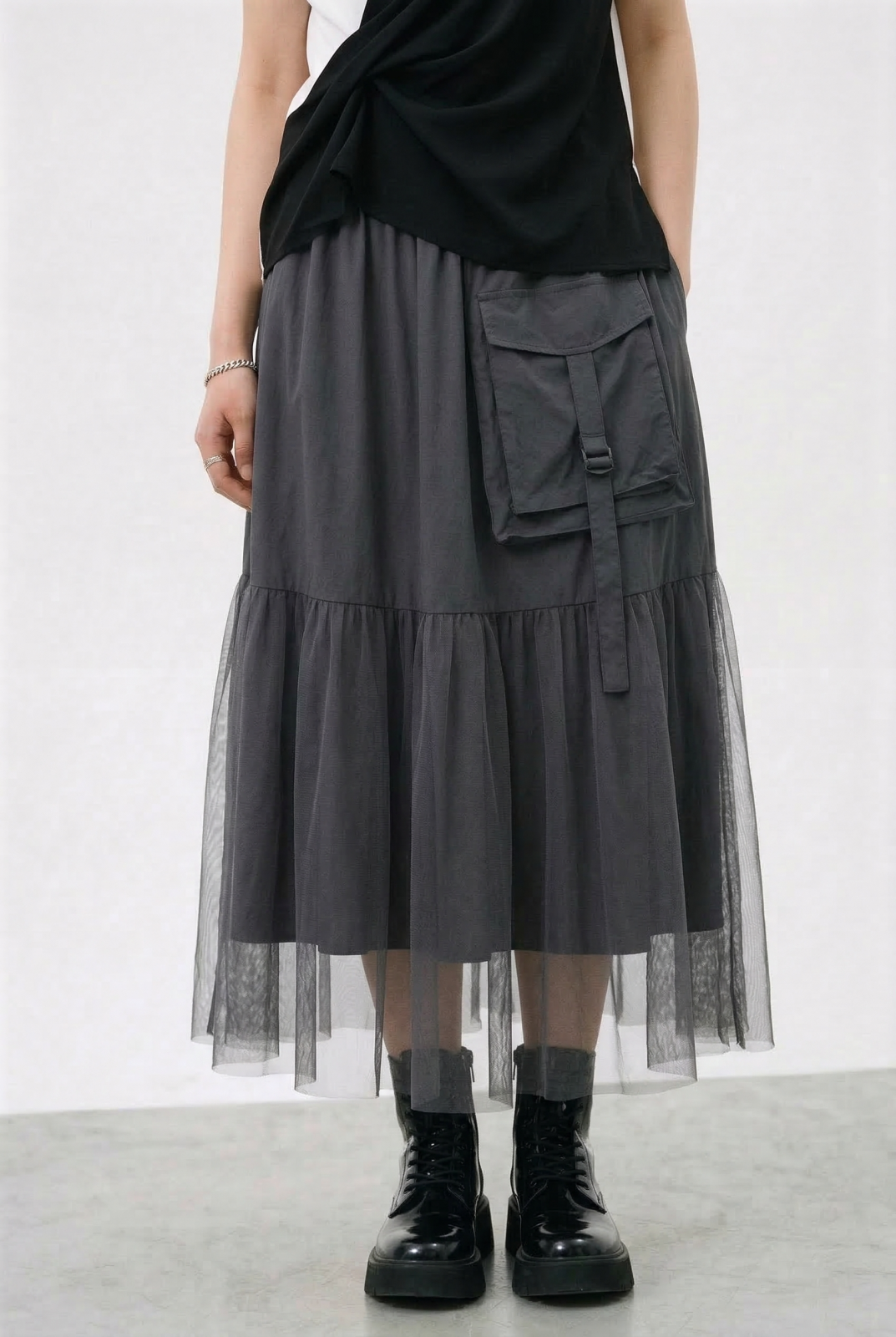 Fusta lunga cu insertie de tulle si buzunar aplicat, gri Talie unica