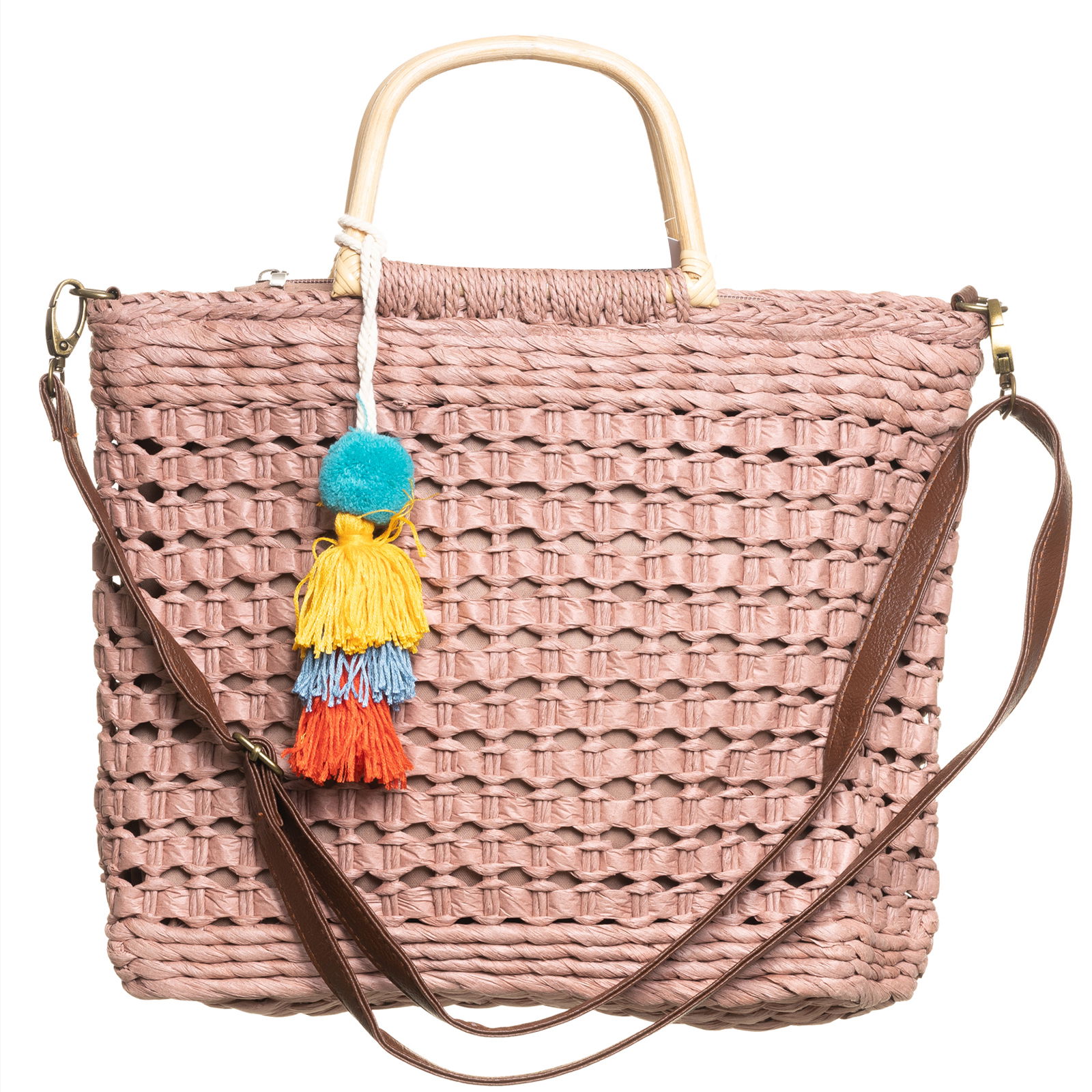Geanta impletita tip cos cu manere subtiri din bambus si ciucuri multicolori, roz prafuit
