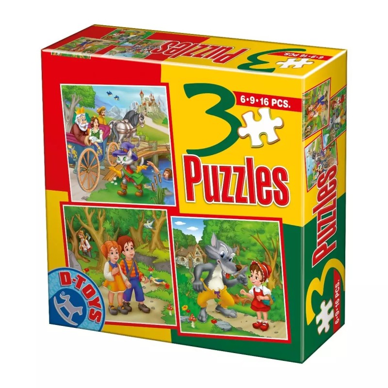 Set 3 Puzzle-uri Basme: Scufita Rosie, Hansel si Gretel, Motanul Incaltat, D-toys