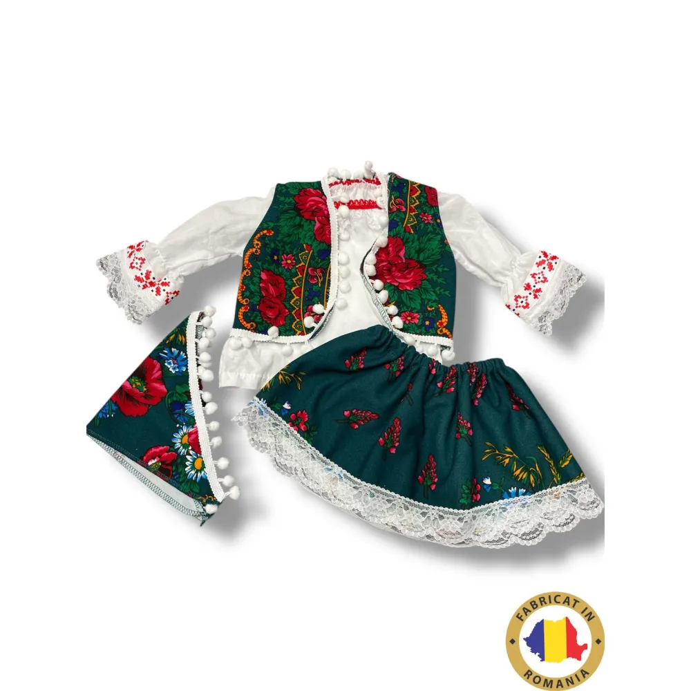 Costum tradițional fetițe – model verde cu motive florale