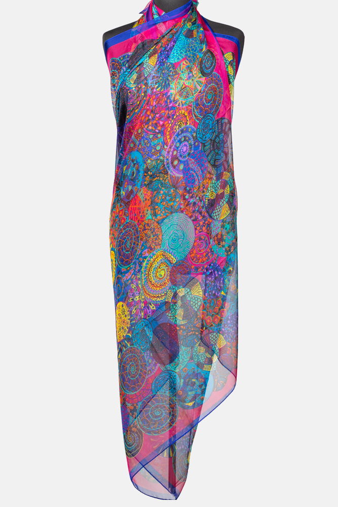 Esarfa dreptunghiulara tip pareo, cu imprimeu mandale multicolore margine albastra si fucsia, din matase si vascoza