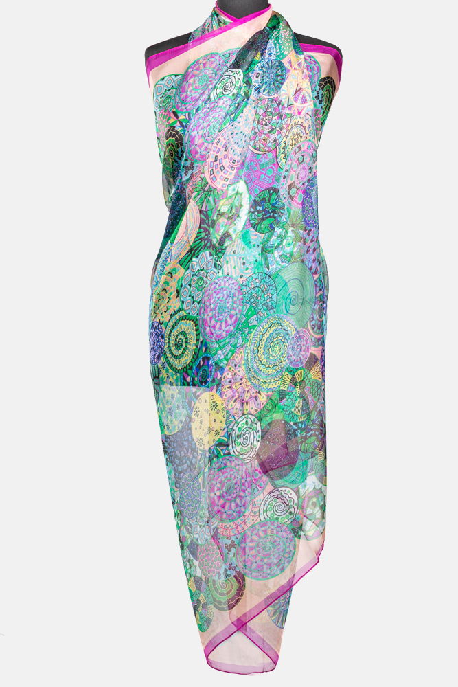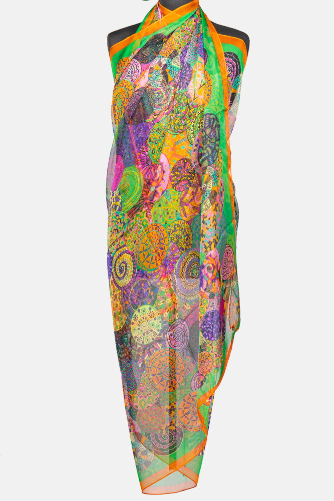 Esarfa dreptunghiulara tip pareo, cu imprimeu mandale multicolore margine portocalie si verde, din matase si vascoza