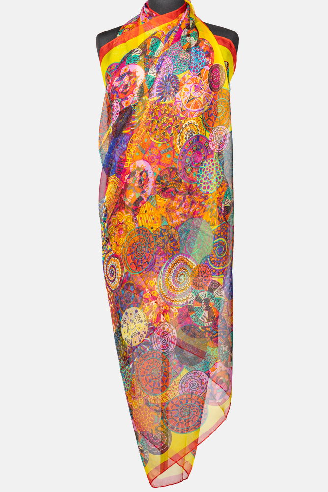Esarfa dreptunghiulara tip pareo, cu imprimeu mandale multicolore margine rosie si galbena, din matase si vascoza
