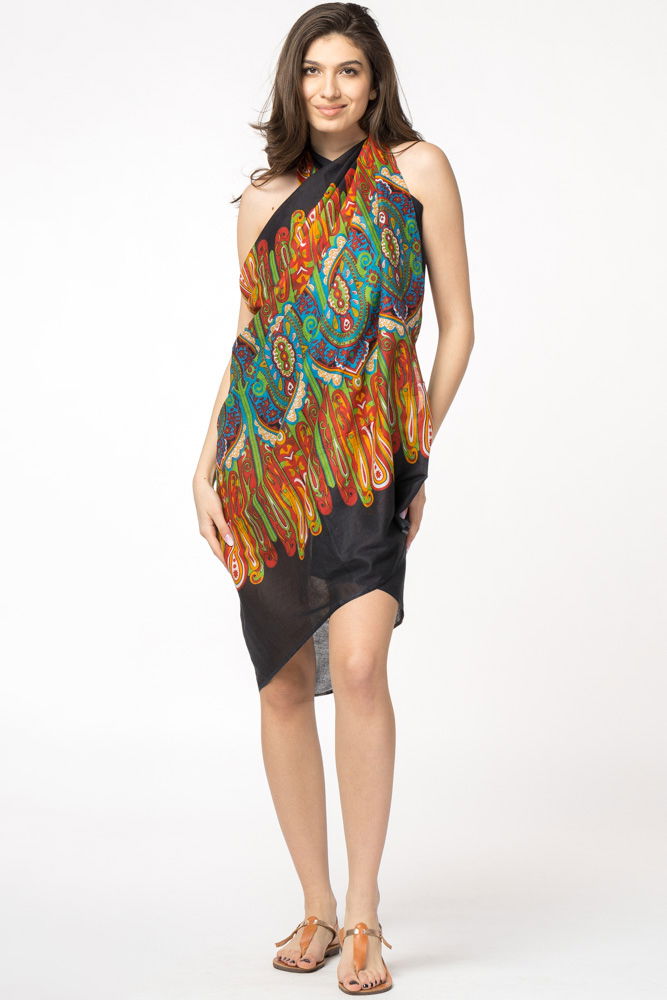 Esarfa mare dreptunghiulara tip pareo, cu imprimeu multicolor pe fond negru, din bumbac