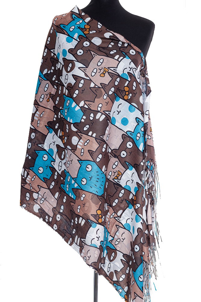 Esarfa casmir cu pisici cu ochi mari predominant maron si turcoaz