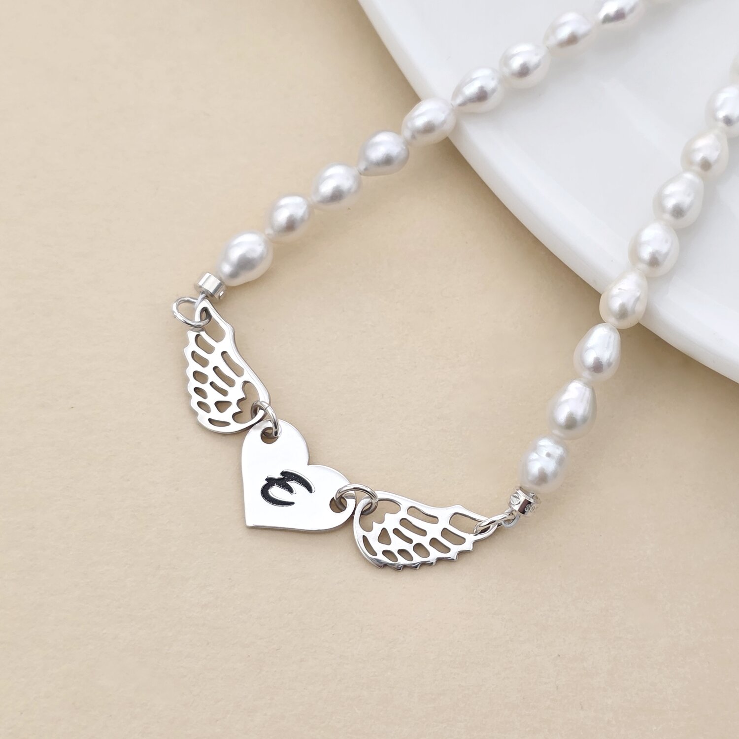 Colier Inima Gravata cu Aripi - Sirag de Perle Rice - Argint 925