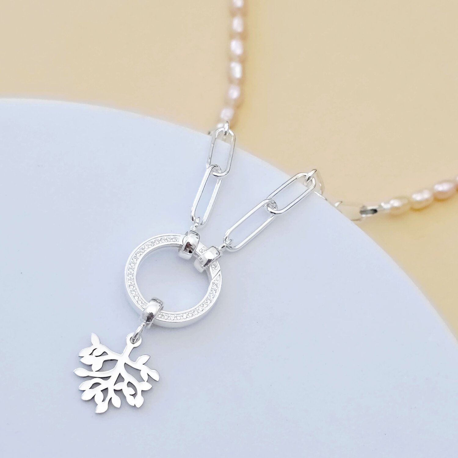 Lantisor cu Perle - Ramura intelepciunii - Model sirag perle rice peach, lant cu zale dreptunghiulare si element cu Zirconii - Argint 925