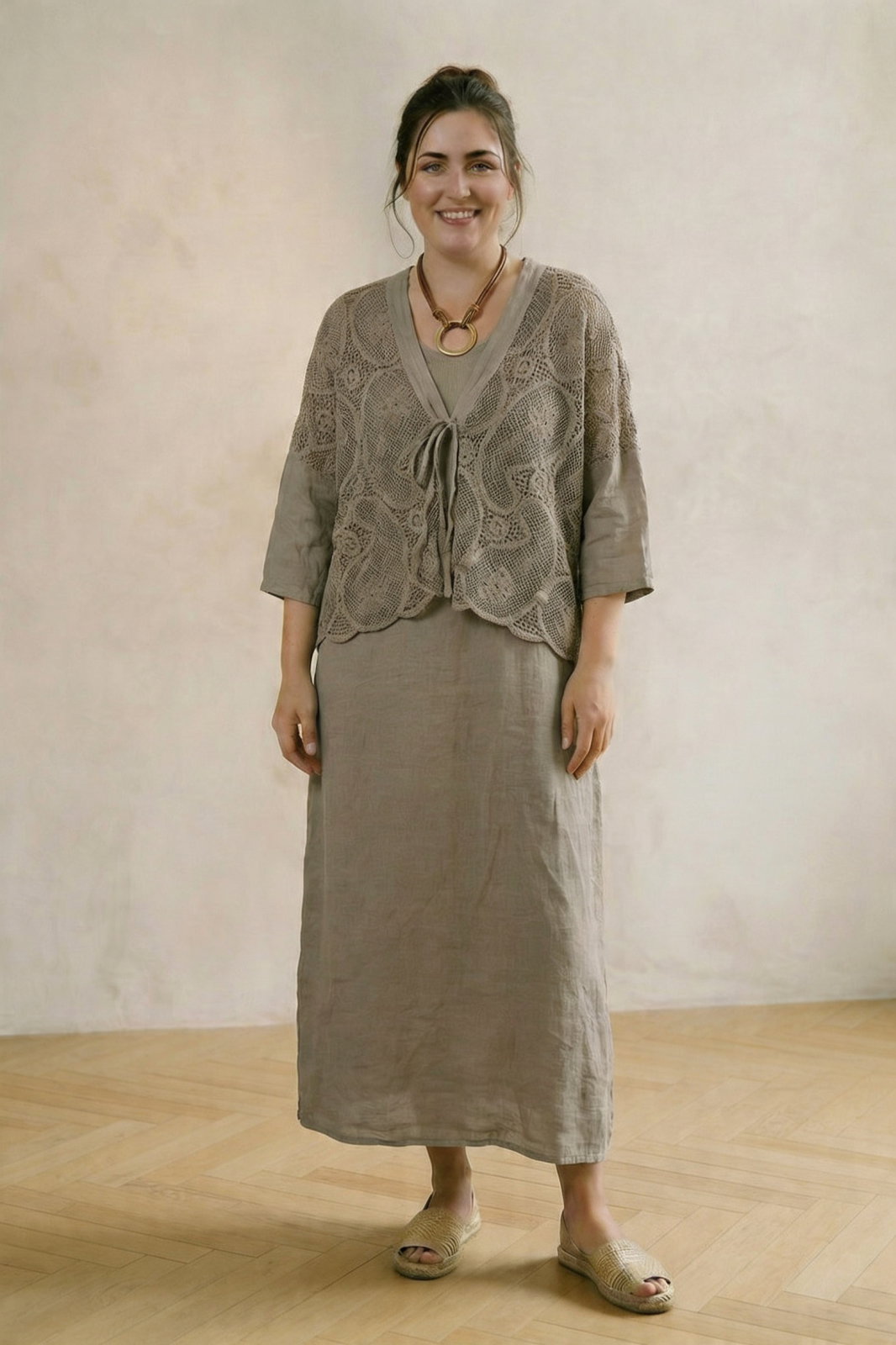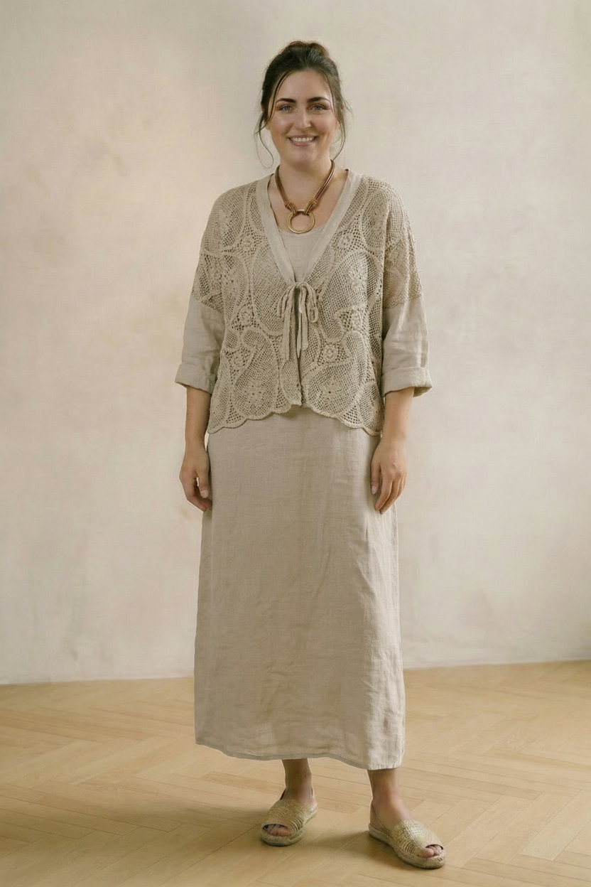 Compleu rochie lunga din in cu blazer dantelat si croi lejer boem elegant, bej inchis Talie unica