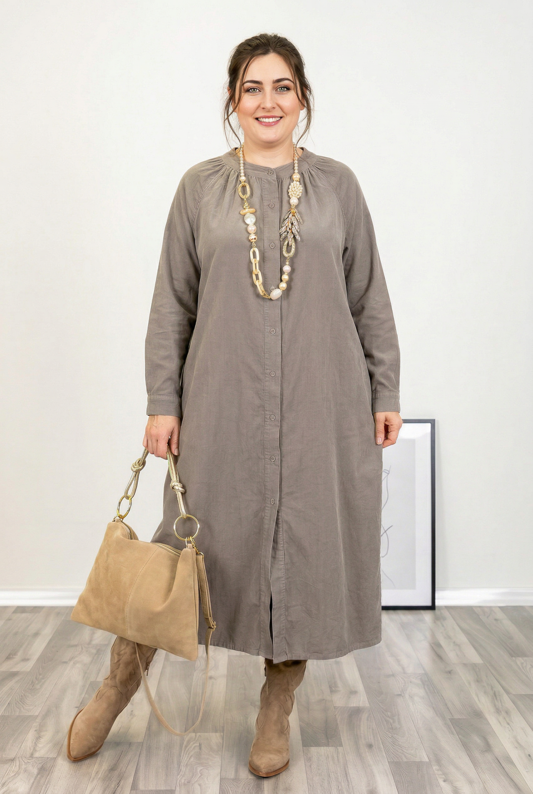 Rochie camasa din catifea reiata, croiala lejera si design versatil, bej inchis Talie unica