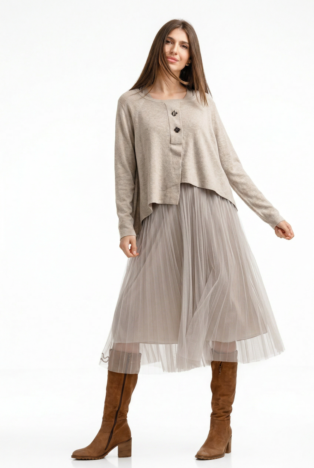Rochie suprapusa din tulle cu puloveras cu nasturi metalici bej Talie unica