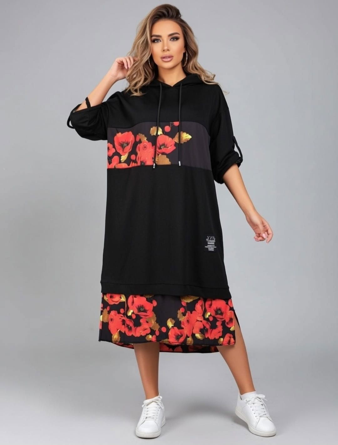 Rochie de dama, Tip Oversize, Bumbac, Elastan, Negru, Gri