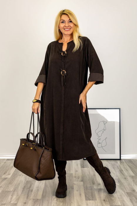Rochie din catifea reiata, cu nasturi mari de lemn pe piept, maro inchis