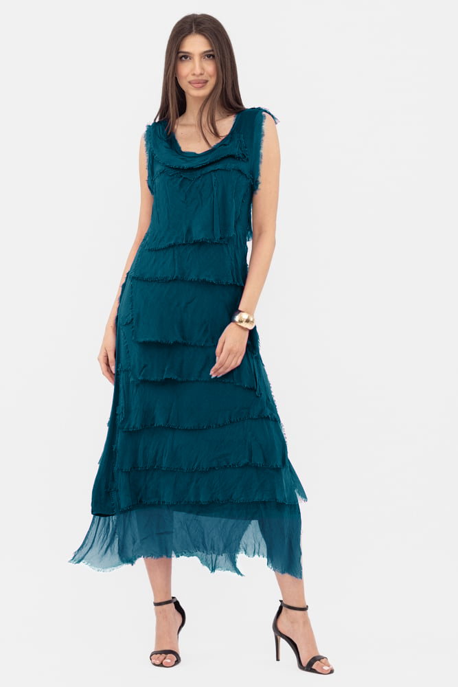 Rochie turcoaz inchis din matase si vascoza cu volane franjurate suprapuse, fara maneci Talie unica