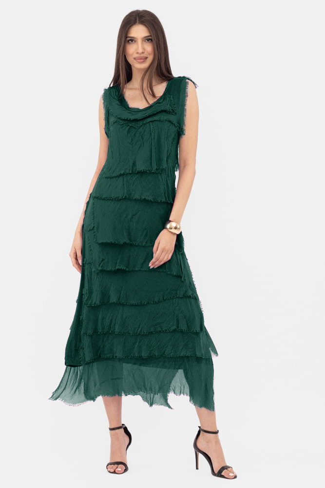 Rochie verde inchis din matase si vascoza cu volane franjurate suprapuse, fara maneci Talie unica