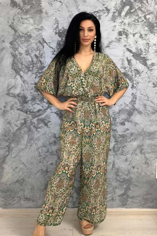 Salopeta dama - dantela - maneca lunga - picioare drepte - verde masliniu - viscoza