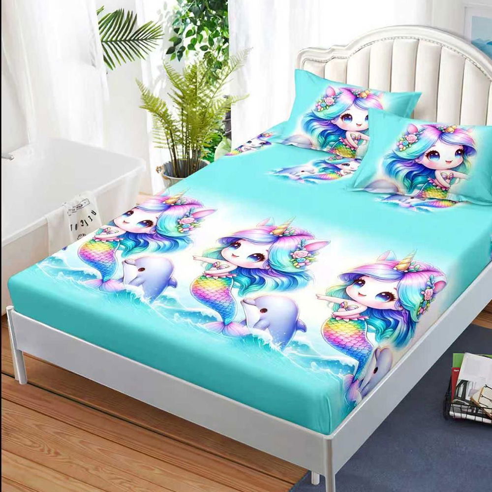 Husa Din Bumbac Satinat Cu Elastic Si Fete De Perna 160X200cm - Sirene Si Delfini - Engros
