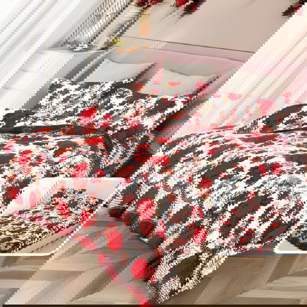 Set 3 Piese Cuvertura de Pat din Bumbac Satinat + 2 Fete de Perna 54x75 cm - Trandafiri Rosii - CVBS_M133B