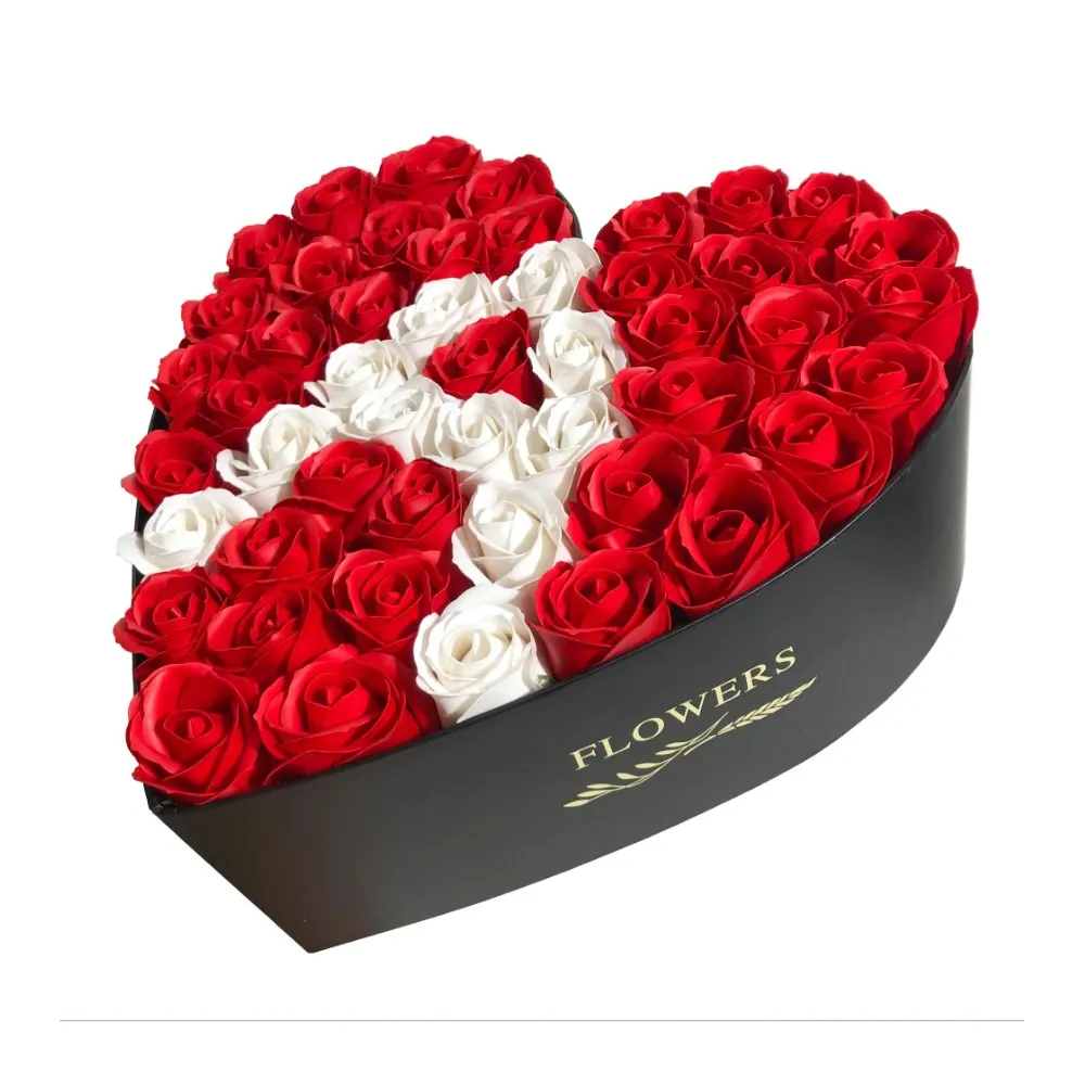 Aranjament Floral Trandafiri Sapun - Cutie Inima 41 Trandafiri Rosu cu Alb - VLTN118