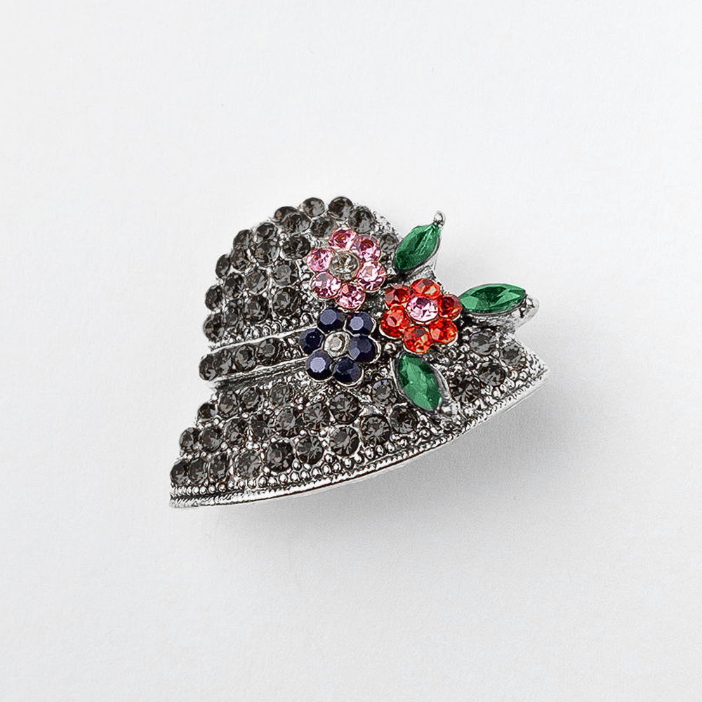 Brosa metalica argintiu antichizat palariuta cu pietricele argintii si flori multicolore