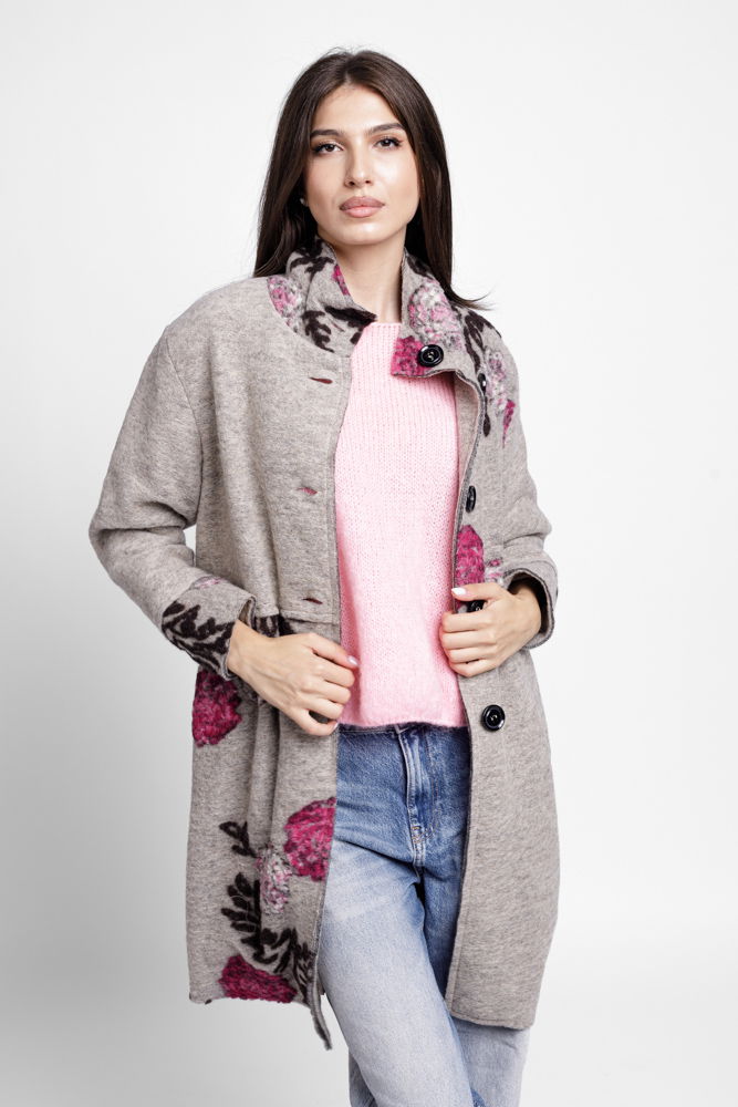 Palton bej, captusit, cu flori colorate, din lana naturala Talie unica